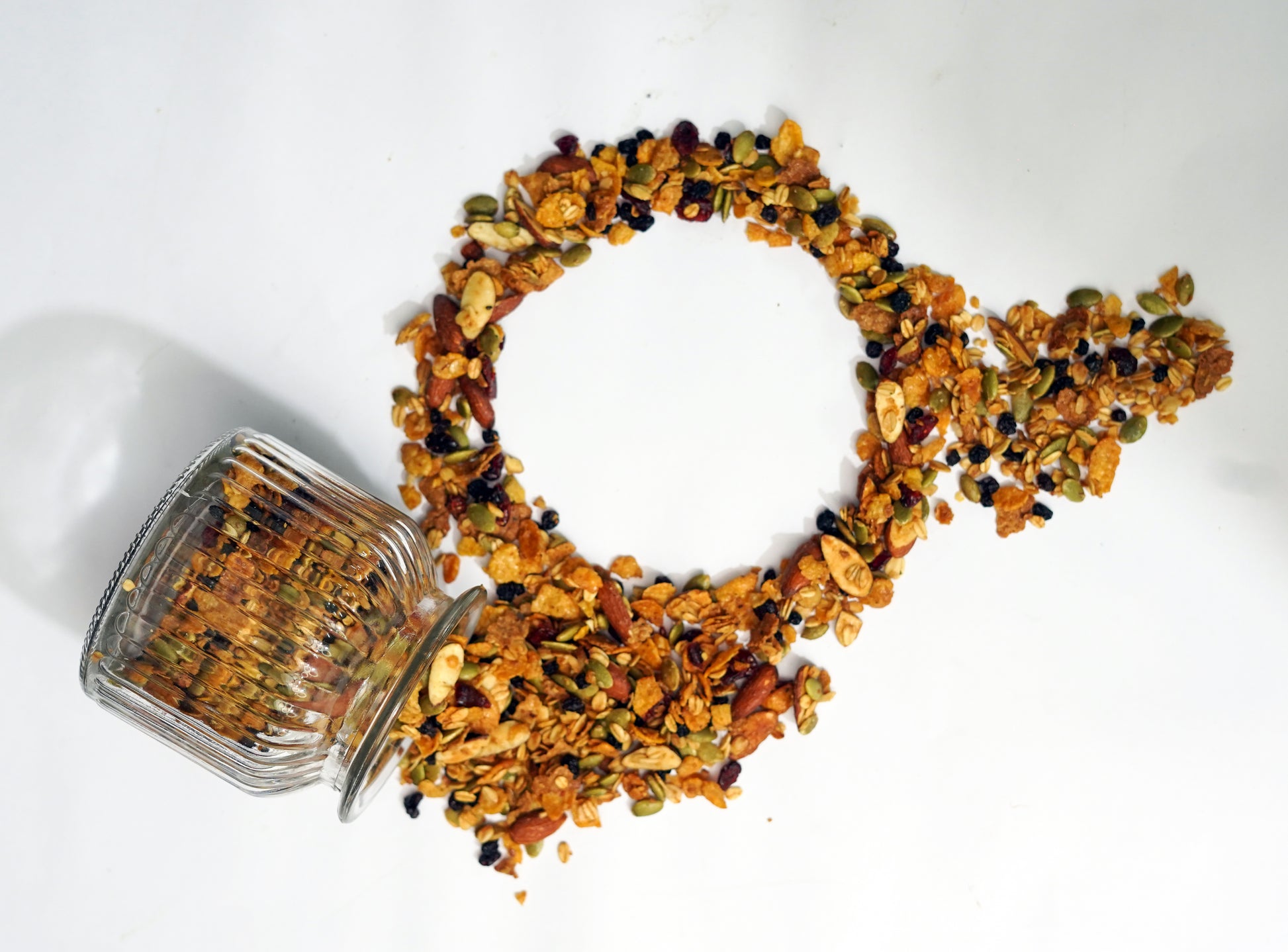 Crunchy granola with no added sugar, sweetened with Stevia. Includes almonds, cranberries and seed mix.