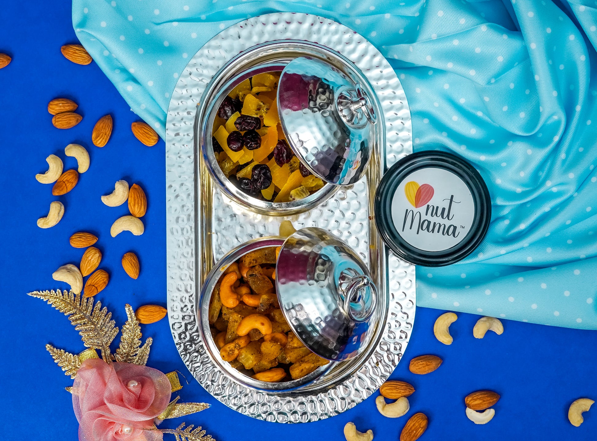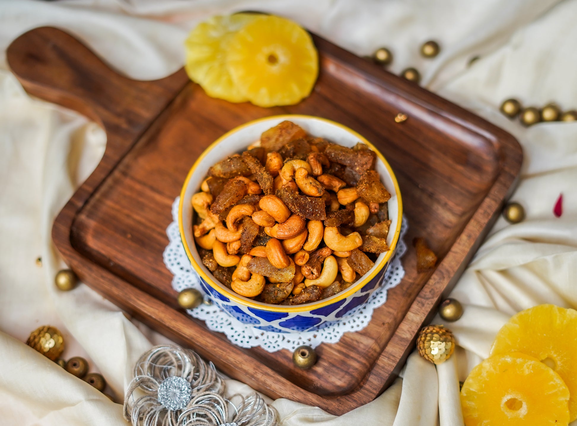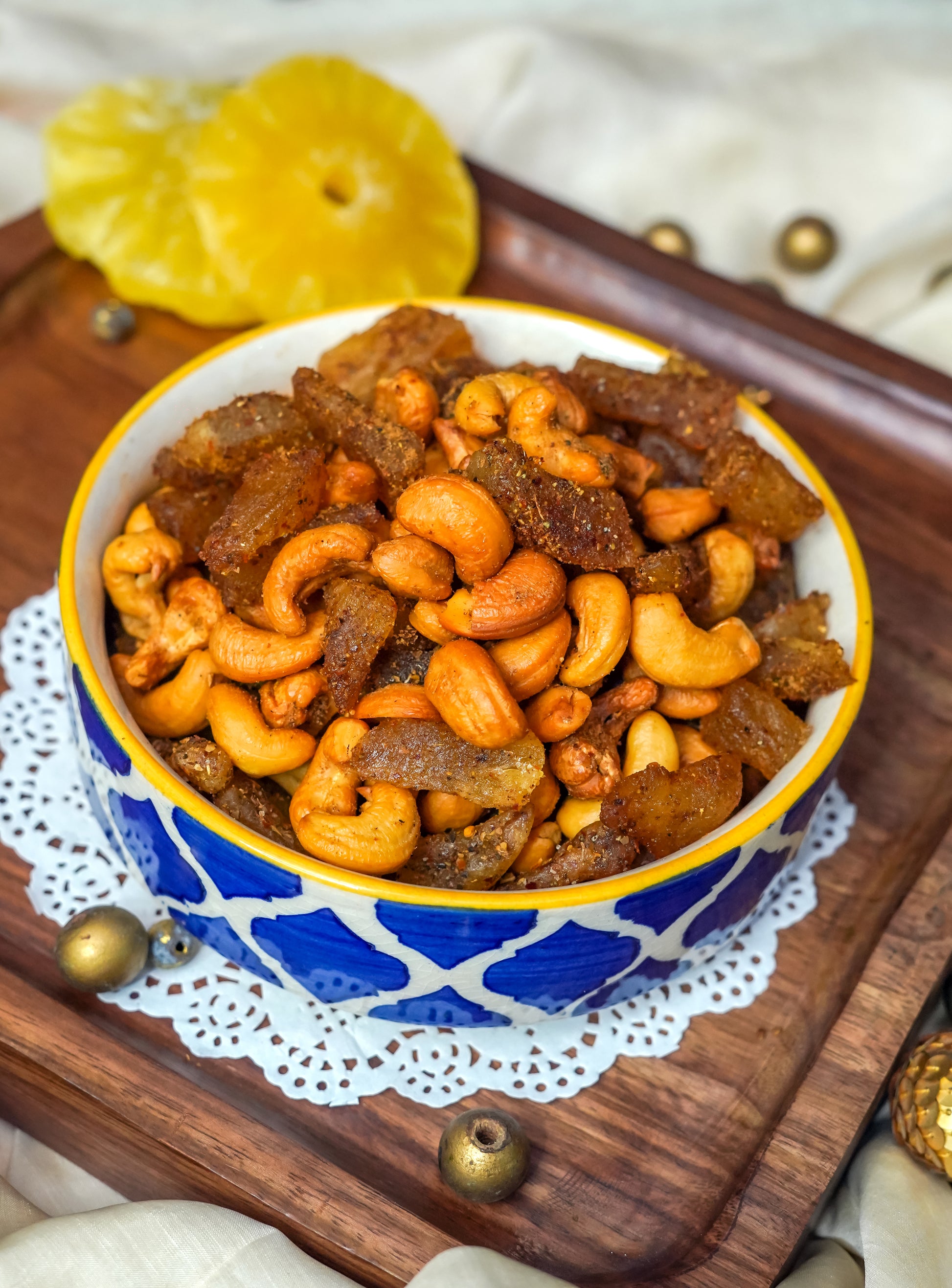 Juicy pineapple bits and crunchy cashews tossed in zesty Mexican masala. A perfect party starter.